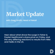 Devon Head of Retail Greg Smith talks to ZB’s Mike Hosking about what drove the surge in Fisher & Paykel Healthcare’s share price on Friday. He also discusses the very differing reactions to results from Nike and FedEx in the US, both of which are seeing demand normalising in a post Covid world and amidst a slowing economy.